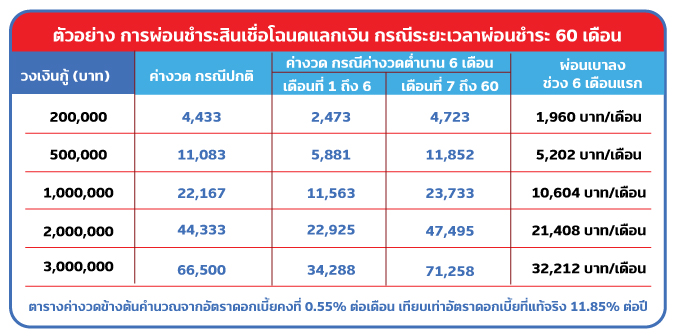 *จำนวนเงินที่ผ่อนชำระตามตารางนี้ คำนวณจากวงเงินกู้ตามที่ระบุในตาราง โดยแบบที่ 1 คิดอัตราดอกเบี้ยคงที่ 0.55% ต่อเดือน (เทียบเท่าอัตราดอกเบี้ยลดต้นลดดอก 11.85% ต่อปี ระยะเวลาผ่อนชำระ 60 เดือน) แบบที่ 2 คิดอัตราดอกเบี้ยคงที่ 0.75% ต่อเดือน (เทียบเท่าอัตราดอกเบี้ยลดต้นลดดอก 15.91% ต่อปี ระยะเวลาผ่อนชำระ 84 เดือน) ทั้งนี้หากจ่ายโปะ หรือปิดบัญชีก่อนกำหนดจะทำให้จ่ายดอกเบี้ยในจำนวนที่น้อยลง