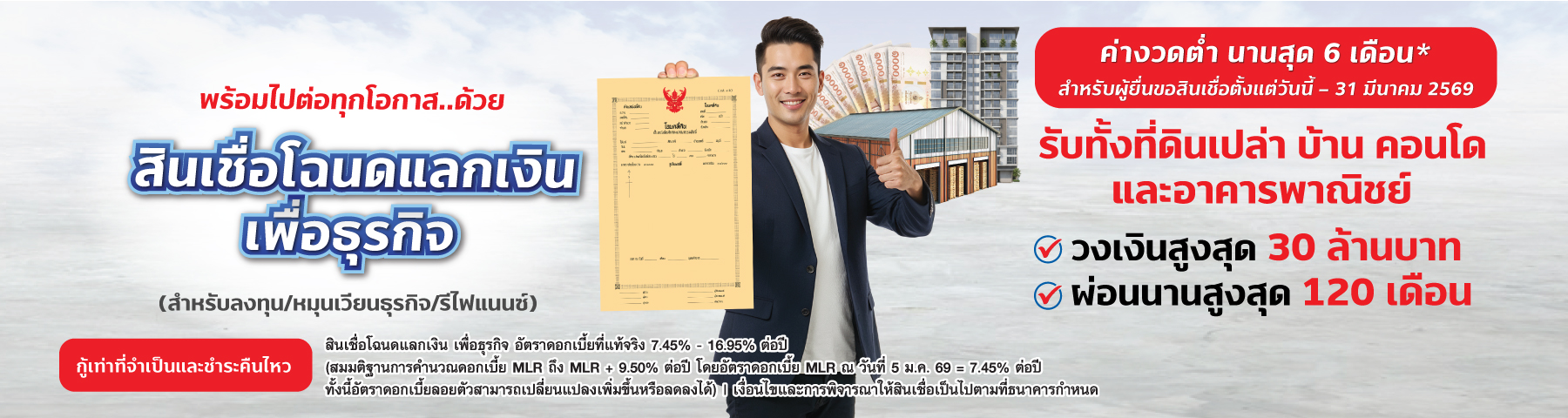 - สินเชื่อโฉนดแลกเงิน เพื่อธุรกิจ อัตราดอกเบี้ยที่แท้จริง 7.55% – 16.95% ต่อปี (สมมติฐานการคำนวณดอกเบี้ย MLR ถึง MLR + 9.40% ต่อปี โดยอัตราดอกเบี้ย MLR ณ วันที่ 3 ก.ย. 68 = 7.55% ต่อปี ทั้งนี้อัตราดอกเบี้ยลอยตัวสามารถเปลี่ยนแปลงเพิ่มขึ้นหรือลดลงได้)